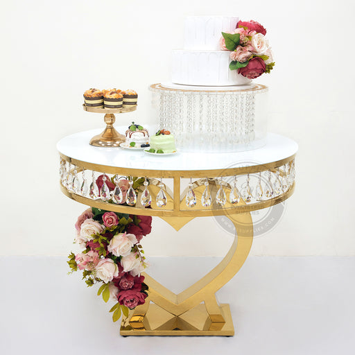 View full detailsOur lovely GEMMA HATHOR cake table with a stainless steel heart-shaped base and a frame lined with hanging chandelier crystals is a twist on our st...